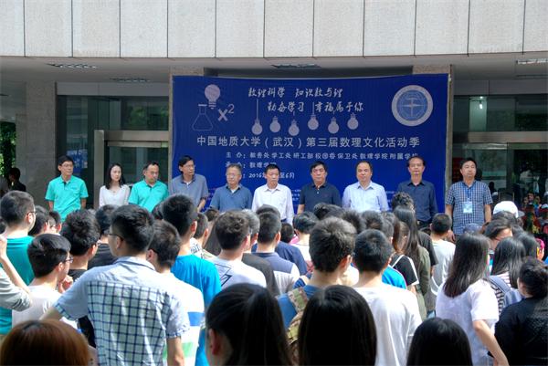 2016年5月12日下午14:30点,第三届数理文化季暨数理科普开放日活动在西区基委楼前顺利举行。中国地质大学副校长赖旭龙、学工处处长王林清、研工部部长喻芒清、保卫处处长代清风、十大买球官方网站党委书记李宇凯、十大买球官方网站院长刘安平、附属学校党委书记彭冠军、教务处副处长王兴、校团委副书记朱荆萨与各学院师生代表100余人参加了活动。