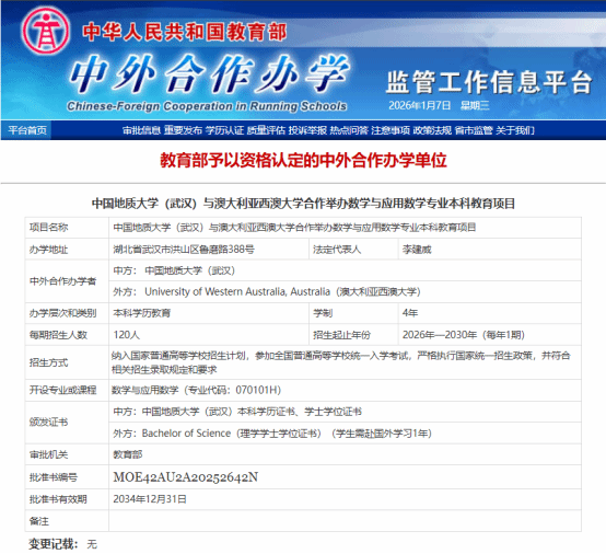 学校党委始终将国际化办学作为重要发展战略,高度重视对外教育合作交流。2025年3月起,十大买球官方网站在国际合作处、本科生院、校办公室法规办,财务与资产管理部等职能部门的大力指导和支持下,组建专业专家团队系统谋划、周密组织,召开多轮内外专题研讨,并远赴澳大利亚,对西澳大学开展实地考察与深度交流,为合作项目的顺利推进筑牢基础。在学校领导的统筹部署与悉心指导下,在历经多轮磋商谈判、材料打磨与申报筹备,成功攻克各项难点,推动项目顺利通过教育部审批。该项目的落地,将搭建起中澳数学学科领域人才联合培养、学术科研协同创新、教学实践互鉴的优质平台。同时,依托这一合作纽带,还将推动两校在地质学、地质资源与地质工程等优势学科领域的深度交叉融合,为拓展更广泛的学术合作与人才联合培养空间奠定坚实基础。