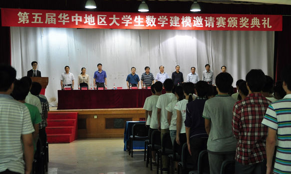 下午2:00颁奖典礼在响亮的国歌声中拉开序幕。第一项,主持人向观众介绍了到场嘉宾及第五届华中地区大学生数学建模邀请赛的比赛情况。本届邀请赛接受到的报名参赛队伍共有1280支,其中涉及21个省、市、自治区,55所高校,4000多名在校大学生。第二项由十大买球官方网站副校长赖旭龙致开幕词,他首先对获得此次竞赛奖项的同学表示祝贺,并鼓励大家积极参赛。接下来便是向一、二、三等奖的获奖同学代表颁奖。各位领奖代表、颁奖嘉宾拍照留念,场面气氛十分活跃。颁奖典礼第四项是由十大买球官方网站党委研工部部长喻芒清为十大买球官方网站研究生数学建模基地授牌,由十大买球官方网站副院长彭放揭牌。第五项由十大买球官方网站院长刘安平致辞。刘院长鼓励没有获奖的同学不要灰心,继续努力,比赛重在享受过程,这次的经历必将成为每位同学人生道路上一笔宝贵的财富。大会第六项由本次比赛一等奖获奖队伍代表,来自武汉大学的刘才荣同学发言。她向在场同学讲述了她的数模之路,与大家分享了自己数模学习的经验与心得。颁奖典礼的最后一项是由武汉工业与应用数学学会副理事长