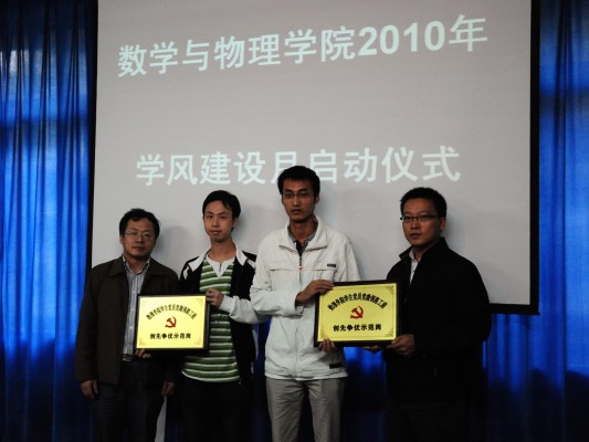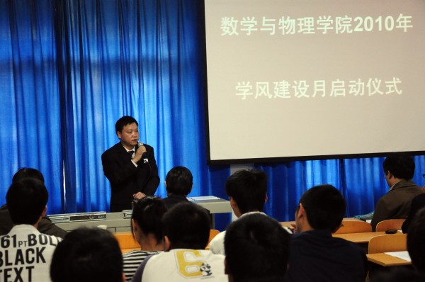 杨伦处长肯定了学风建活动的重要意义及其必要性,并要求广大同学端正学习态度,明确学习目标,努力学习,珍惜时光。学工处王林清处长认为此时开展学风建设活动及时必要,他要求十大买球官网广大学生干部要加强自身学习,树立榜样,同时组织好班级建设,多下功夫,落实好此项工作。学院彭放副院长宣读了《十大买球官方网站关于开展2010年学风建设月活动》的通知文件,并要求广大学生党员和学生干部以班级为载体,认真、有效的做好这次活动。最后,刘安平院长以亲身教学经验谈了优秀的学风对教师和学生的积极作用,再次强调十大买球官网开展此次学风建设活动的重要意义。启动仪式中,教务处王兴副处长和校团委成军副书记分别为十大买球官网服务全校学生辅导数理的“学生党员党徽领路工程争先创优示范岗”授牌,学生代表122092姚桔向全院学生发出“学风建设从我做起”的倡议,自此,十大买球官方网站2010年学风建设月活动正式启动,将在10月中旬——12月中旬,陆续开展我爱学数理、我爱上自习、我爱住宿舍、我爱记单词,我爱当老师、我爱面对面、我爱听讲座、我爱去监考等八大系列主题教育活动,突出学生学习自觉性,增强专业归属感和使命感,以学院开展创先争优活动为契机,引领学生党员争做学习标兵、引领普通学生争做学习楷模,进一步巩固和发扬学院学风建设优良传统,进一步促进学院考研率稳步提高。