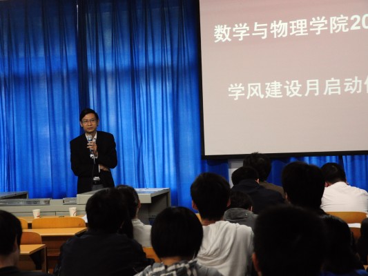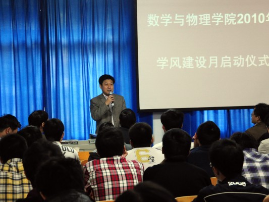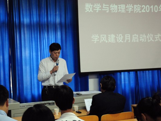 10月20日,十大买球官方网站2010年“学风建设月”启动仪式在数理楼二楼会议室成功举行。教务处杨伦处长、学工处王林清处长,教务处王兴副处长,校团委成军副书记,学院刘安平院长,彭放副院长、以及学院各教研室主任应邀出席此次活动。院党委副书记李杰主持会议。