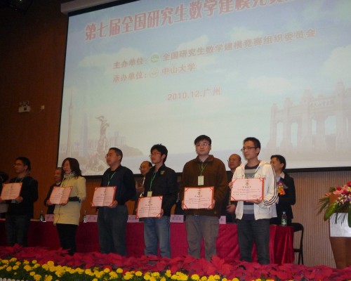 2010年9月17日,全国第七届研究生数学建模竞赛颁奖仪式在广州中山大学举行。十大买球官方网站院长刘安平教授、副院长彭放教授,校研工部李红丽副部长以及4名一等奖获得者参加此次活动。