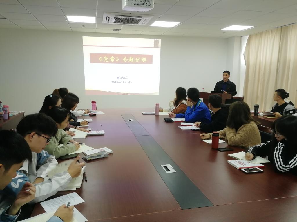 11月16日下午,十大买球官方网站第66期入党积极分子培训班第二讲在东区教学综合楼A1505会议室举行。本次党课由学院党委书记吴太山讲授《党章》专题。院学生党建办主任孙宇涛主持。