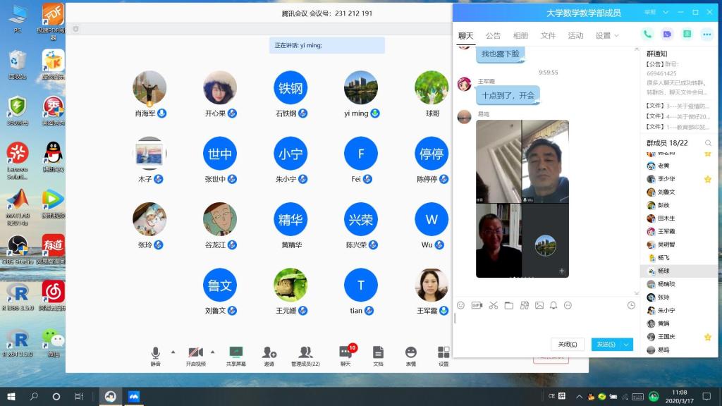 根据网络教学情况汇报,大部分老师采取了Bilibili直播平台、腾讯会议、qq群直播或录播等多种方式展开在线教学,以及利用优质网络资源,让学生进行慕课或学习通软件的在线学习,辅以qq群重点知识串讲和答疑等多种形式。学生的平时作业,大部分老师采取了线上作业和线下作业相结合的方式。有的老师还分享了Bilibili平台场景切换功能来实现屏幕讲解和稿纸细致推导的结合,用B站弹幕、qq匿名的方法鼓励学生提问,qq群采用投票方式实现学生即时回答问题,学生较少的课堂采取学生自己讲的费曼学习法,利用在线后台数据监控学生学习行为和分析学生学习效果等好的在线教学技巧。部分老师也反映了在老家没有网络,手头没有充足资料,在线直播无法点名等一些困难。对于毕业论文,大部分老师要求学生每周在线汇报,进展顺利;部分老师反映虽然前期进展较慢,但有信心指导学生顺利按期完成毕业设计工作和论文撰写工作;少数老师指导的论文涉及到做实验或利用高性能计算机运算,也做好了根据疫情发展情况调整毕业设计(论文)工作内容的预案。对于在线课程考核方案,有的老师提出了根据学生在线考勤、答疑交流的情况并结合学期末课程考试的方式进行成绩评定;有的老师拟采取线上汇报和单元测验的方式进行考核。老师们都纷纷表示这次教学交流非常有必要,学习到了很多好的在线教学经验和技巧。