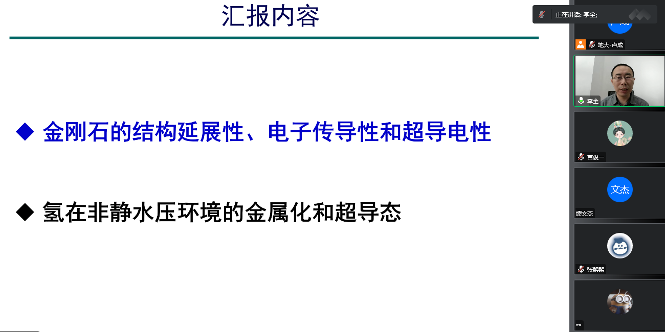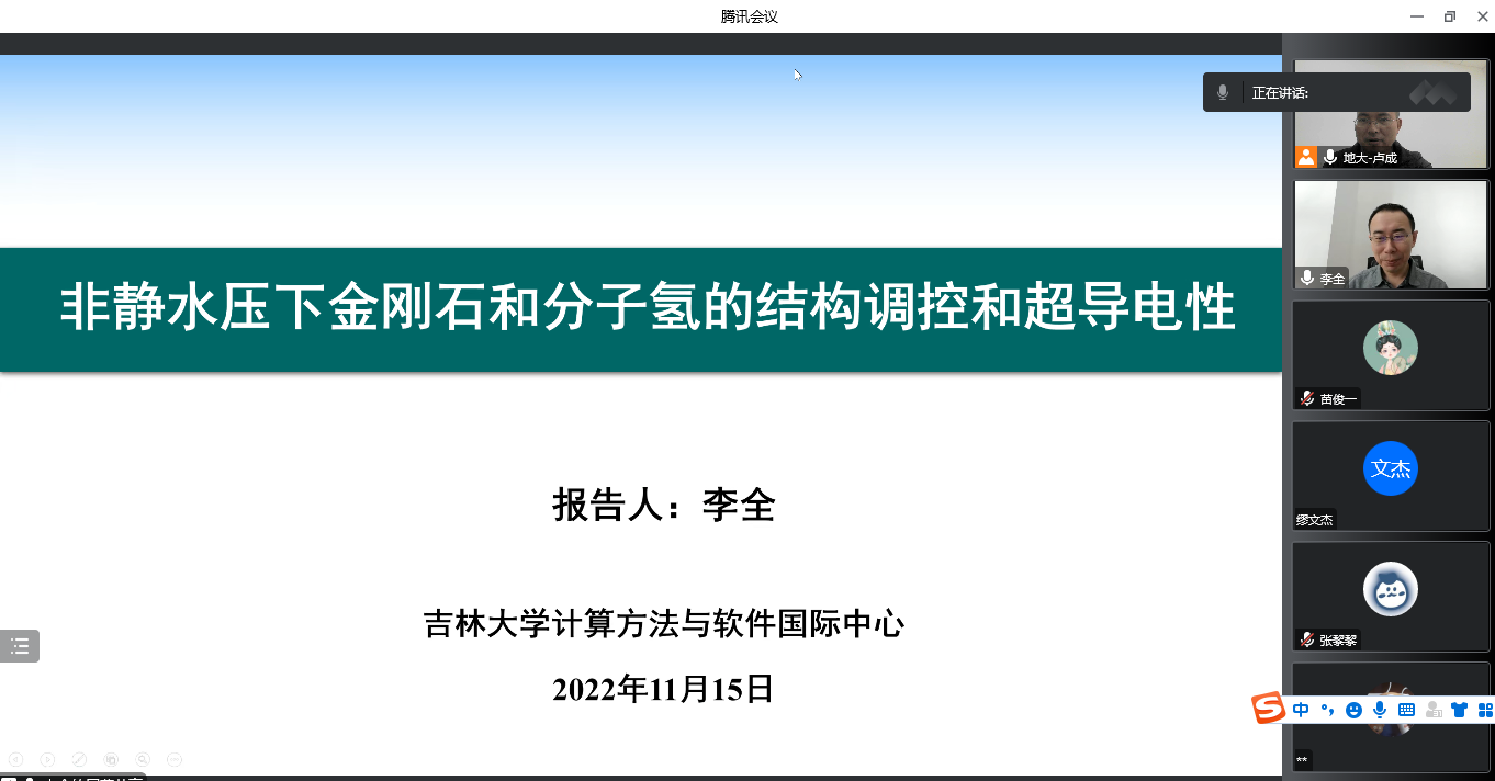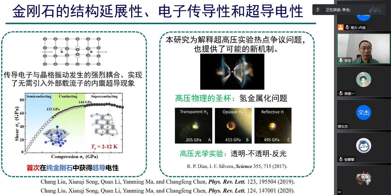 为迎接我校七十周年校庆,11月15日上午,十大买球官方网站通过线上的方式,邀请吉林大学计算方法与软件国际中心李全教授,为我校物理系师生做了题为《非静水压下金刚石和分子氢的结构调控和超导电性》的学术报告。该报告由我校科学技术发展院、十大买球官方网站联合举办,卢成教授主持,本院师生共计60余人参加。