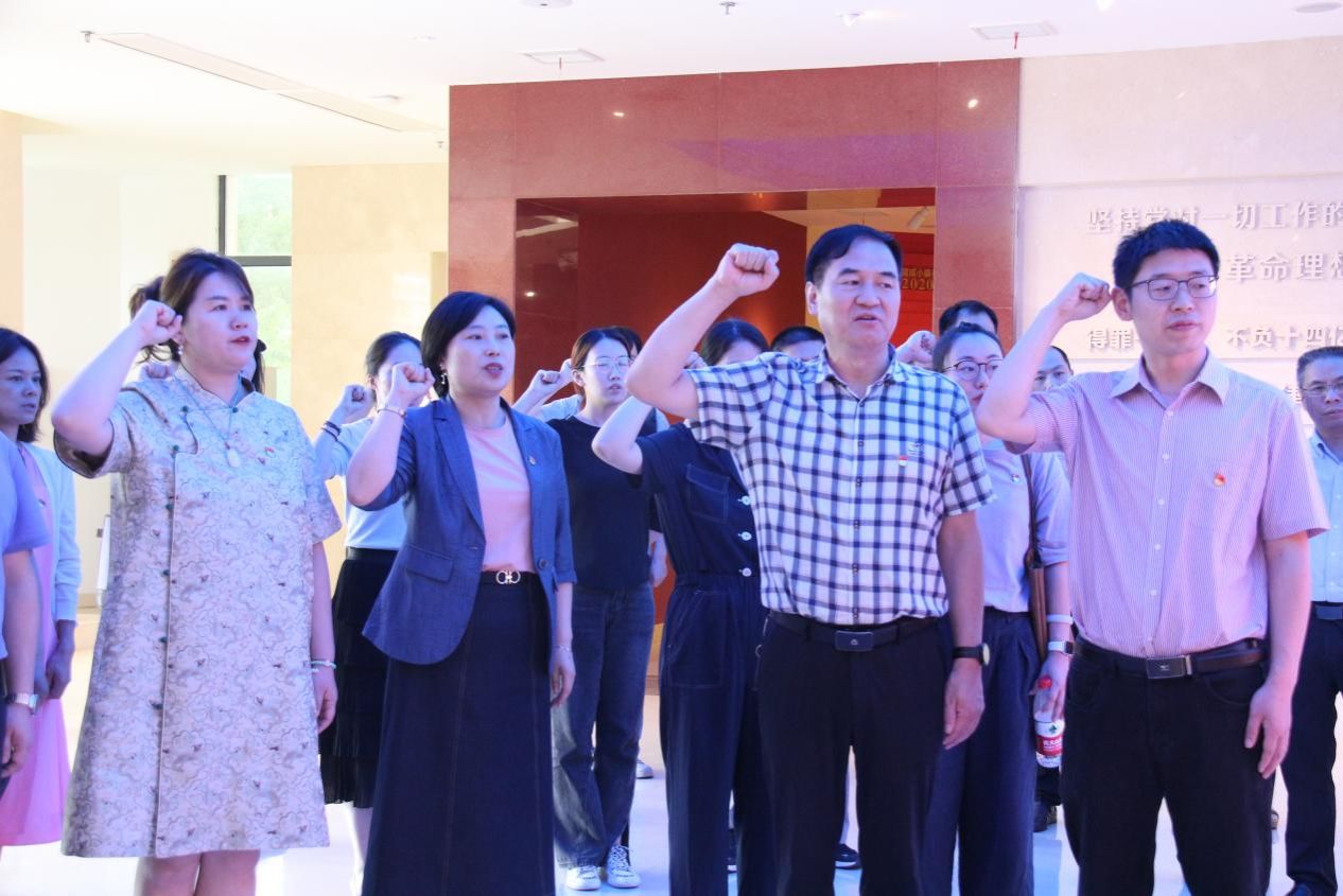 重回一楼展厅后全体党员面向党旗以饱满的热情和昂扬的姿态重温了入党誓词,表达为党的事业奋斗终身的决心和坚定信念。