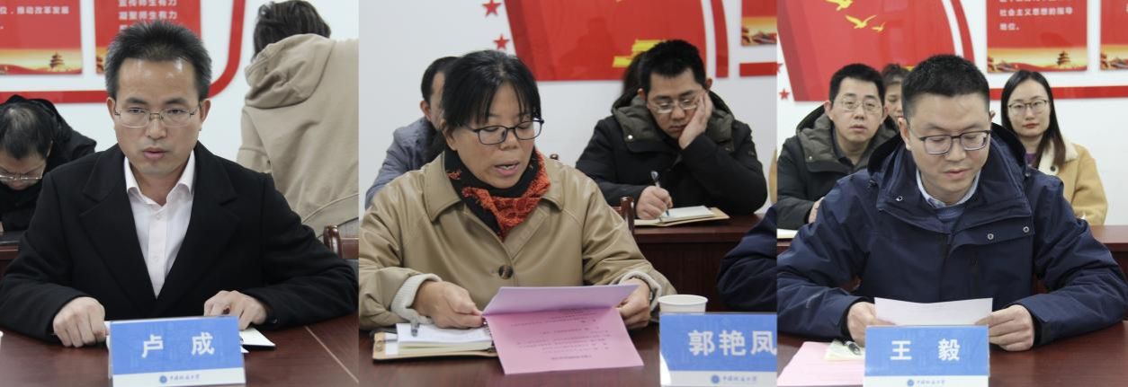 王毅、卢成、郭艳凤三位同志作任职表态发言,他们首先感谢组织的信任与培养,感谢学院历任领导班子为学院建设作出的贡献及为学院的进一步发展奠定的坚实基础,感谢学院全体同事的支持与鼓励,深感责任重大、使命光荣。他们承诺将和班子成员紧密合作,营造风清气正的工作氛围,尽职尽责做到人才强院、以规治院,尽快拓展学科领域,完善学科体系,快速提升学院整体学科水平,不辜负组织、领导和全体师生的信任和支持。