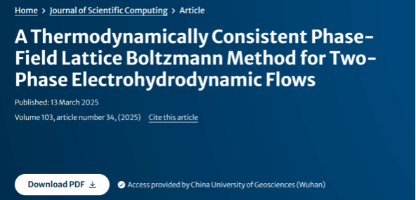 近日,我院2023级硕士研究生熊芳以第一作者身份在计算数学领域国际知名期刊《Jounal of Scientific Computing》上发表了题为”A thermodynamically consistent phase-field lattice Boltzmann method for two-phase electrohydrodynamic flows”的研究论文。该论文由十大买球官方网站为第一通讯单位,汪垒副教授为论文的通讯作者,该论文得到了国家自然科学基金面上项目(NO.12472297)的资助。