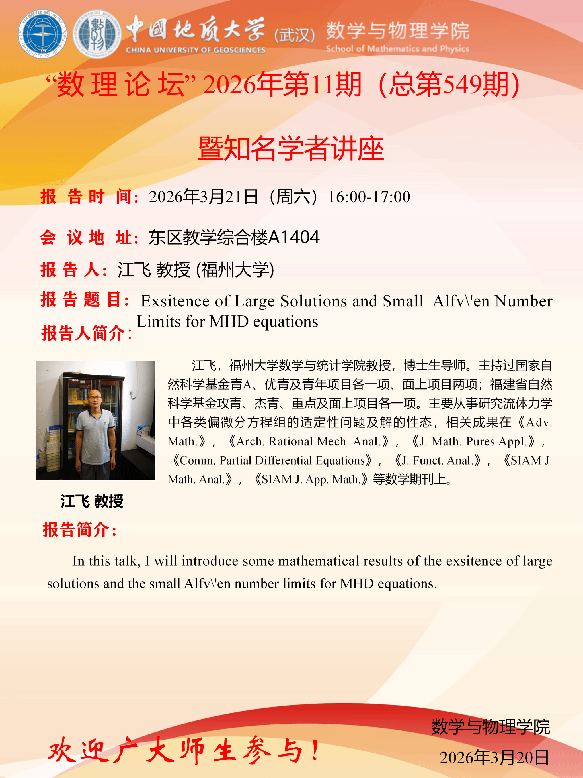 2026年3月21日江飞教授学术讲座:Exsitence of Large Solutions and Small Alfv\'en Number Limits for MHD equations