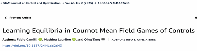 十大买球官网信息与计算科学系教师汤庆博士作为通讯作者的工作 “Learning Equilibria in Cournot Mean Field Games of Controls” 最近发表于SIAM Journal on Control and Optimization。