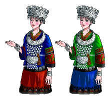 喜戴银饰是苗族姑娘的天性,她们挽发髻于头顶,戴上高约20公分左右,制做精美的银花冠,花冠前方插有6根高低不齐的银翘翅,上面大都打制着二龙戏珠、蝴蝶探花等。