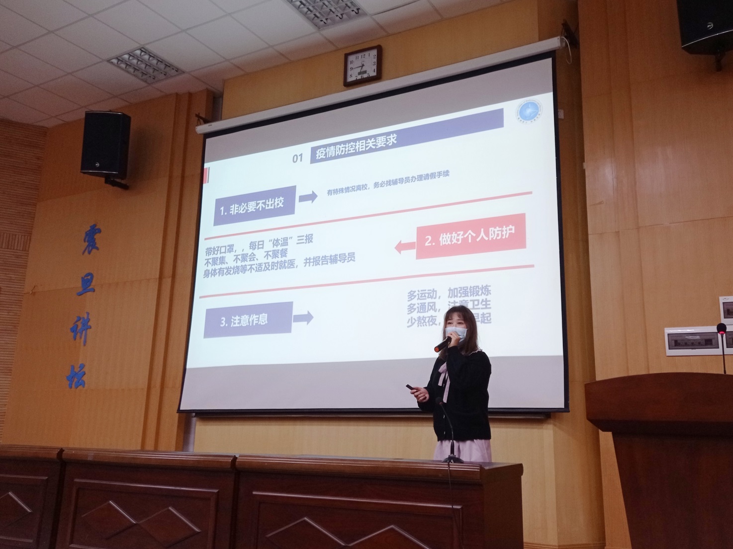 12月1日下午,十大买球官方网站2020级学生安全教育和入党启蒙教育大会在教三楼109召开,2020级预科生、本科生和研究生参加会议,辅导员黄恬恬主持会议。