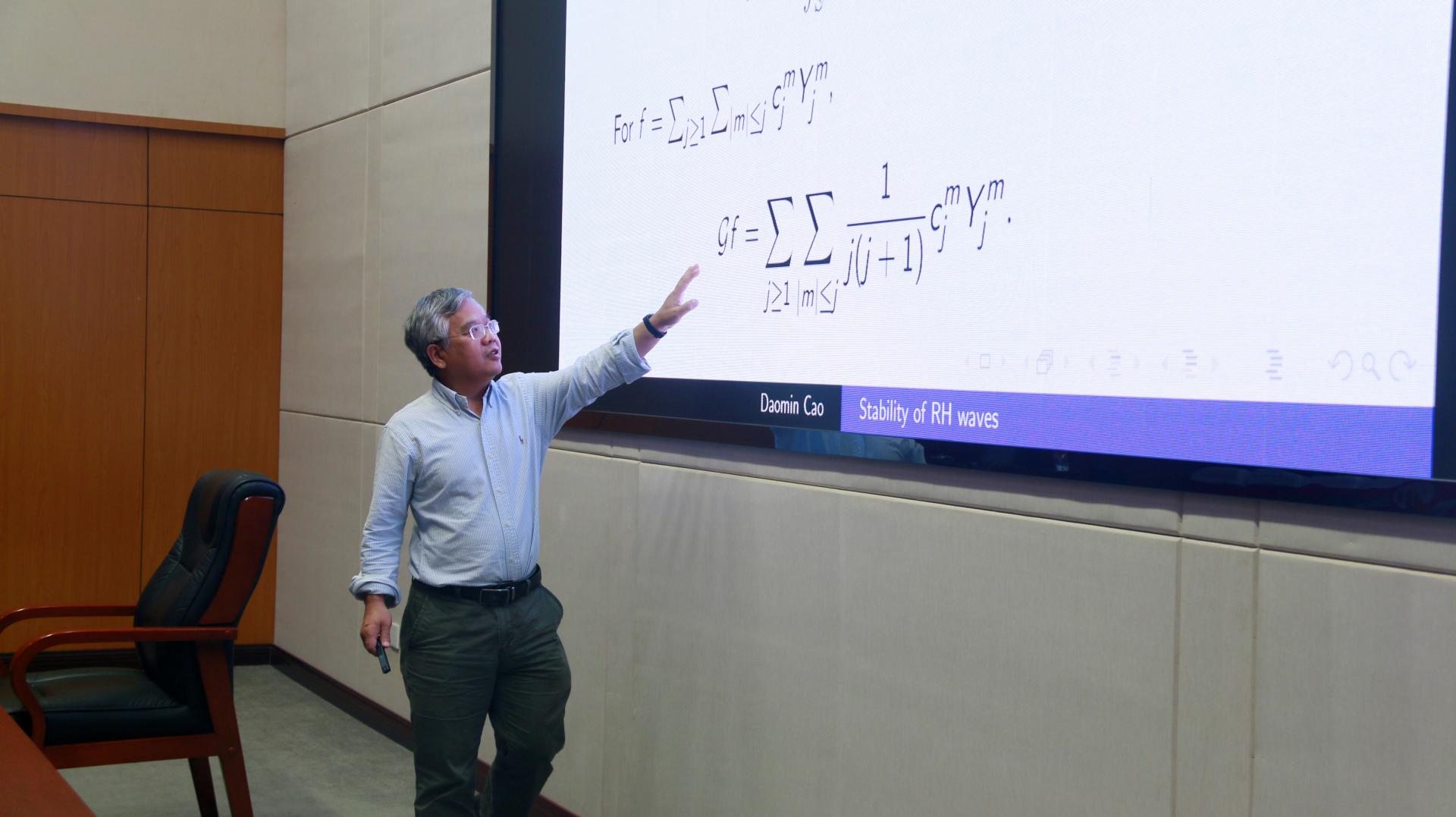 曹道民教授主要介绍了其团队关于二维球面上不可压欧拉方程一类非常重要的精确解Rossby-Haurwitz波的最新研究成果,具体围绕degree-2 的Rossby- Haurwitz波的非线性稳定性展开,证明了数学家Constantin 和 Germain 提出的一个著名猜想。曹教授的讲座内容深刻,深入浅出,非常生动形象和具体的描述了波的来源和产生机制,以及如何利用自然原理推导出一个具体偏微分方程,然后利用新颖的数学方法证明波的非线性不稳定性,在场老师和学生深受启发。讲座结束后,张教授与老师和同学进行了细致地交流和讨论,非常耐心地回答了在场师生的所有问题,现场气氛非常热烈。