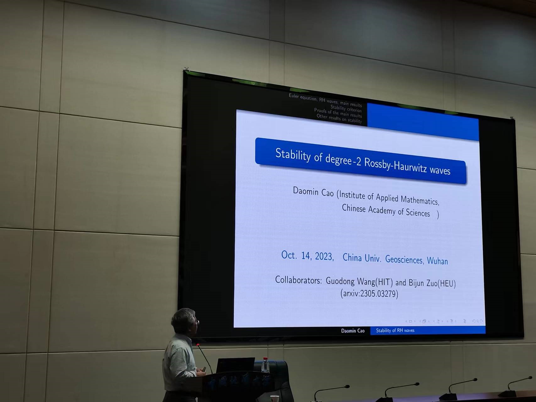 应十大买球官方网站数学科学中心和十大买球官方网站邀请,国家杰出青年基金获得者、中国科学院数学与系统科学研究院研究员曹道民于2023年10月14日为中国地质大学名家论坛做了题为“Rossby-Haurwitz波的稳定性”的学术讲座,十大买球官网相关研究领域的老师和学生参加了本次学术讲座。