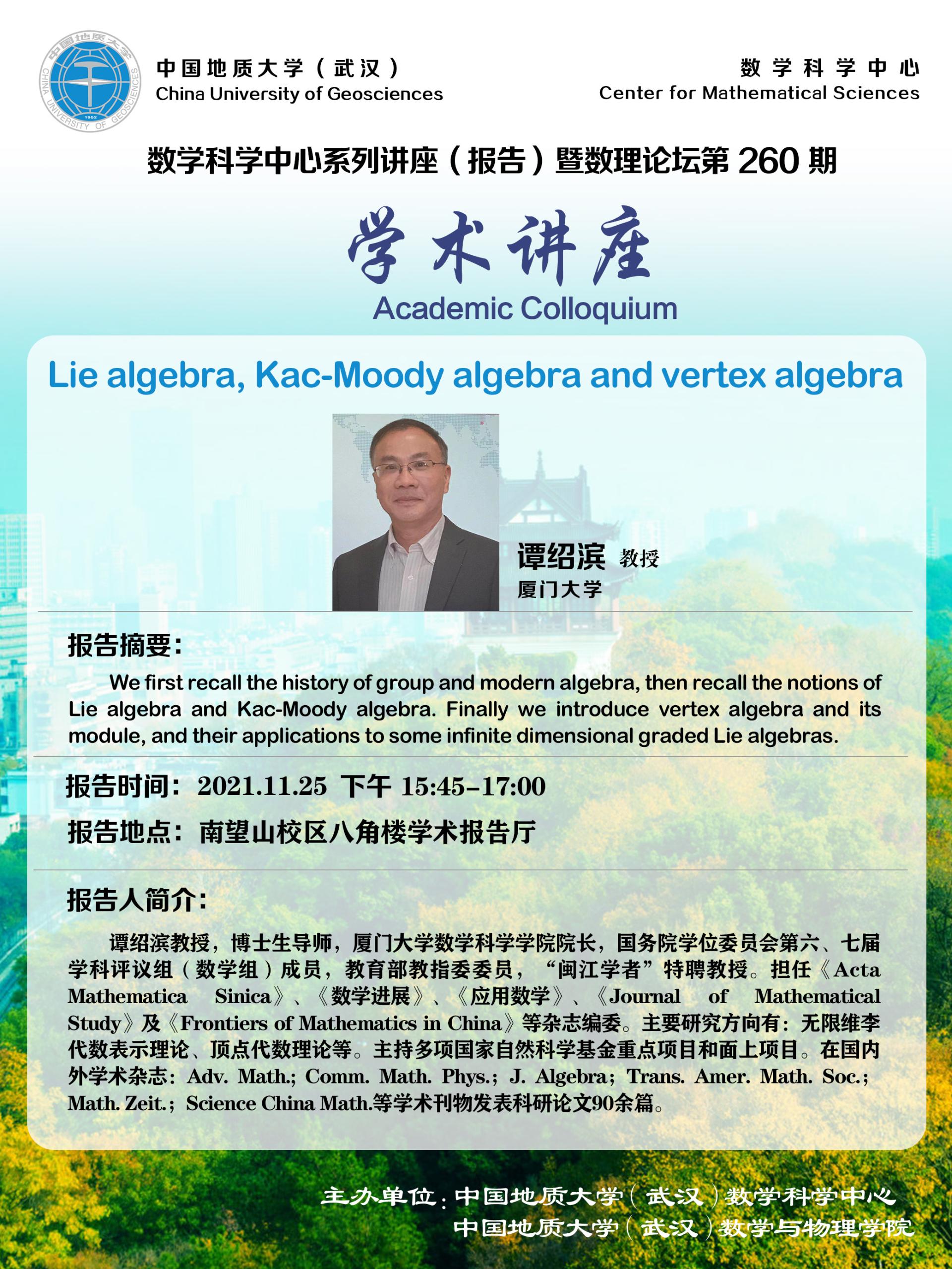 "数理论坛"第260期暨数学科学中心系列讲座(报告):Lie algebra, Kac-Moody algebra and vertex algebra